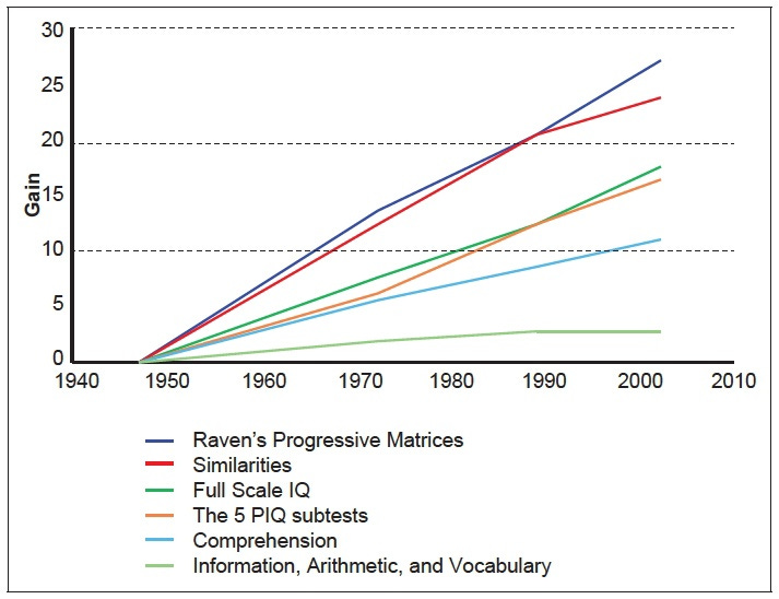 While the “Flynn effect” does exist, the effect is largely because the tests are not measuring the same properties in different cohorts. The best evidence for this are the tests of measurement invariance which find that IQ tests are biased in favour of recently born cohorts. The second is that different measurements of intelligence appear to be changing at different rates: reaction time, colour differentiation, and backward digit span are all declining; crystalized ability has been constant since the 50s; and every other test has been increasing across time.