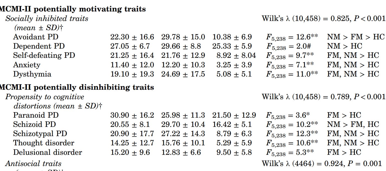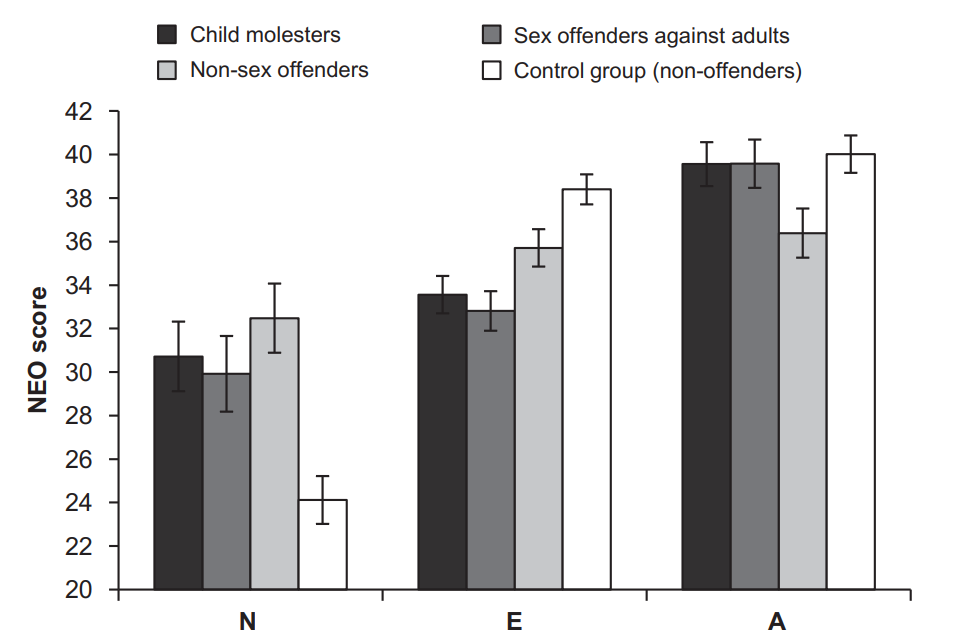 The pedophile personality profile2 replicates, and regular sexual offenders have similar personalities to them: low extraversion and high neuroticism. Still no difference in agreeableness, a point against the power explanation.
