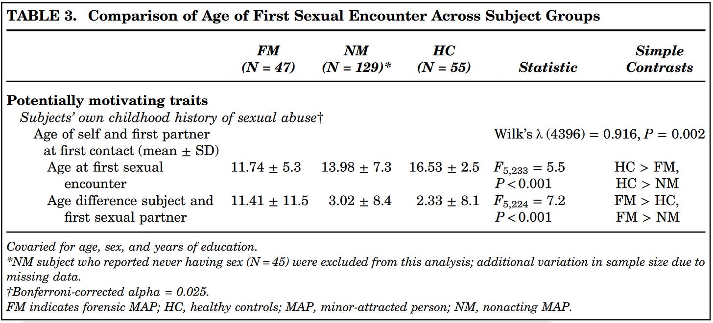 Non-offending pedophiles (NM) and healthy controls were unlikely to have been abused by an older person when they were a child. Offending pedophiles (FM), on the other hand, were much more likely to have been abused (according to them… at least).