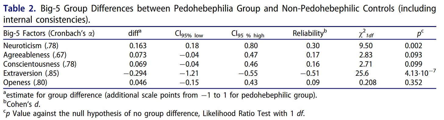 Accordingly, they are more likely to have fewer friends, and be less likely to psychologically tolerate their lack of them. They don’t have lower levels of conscientiousness, which seems believable, since most pedophilic crimes are premeditated.