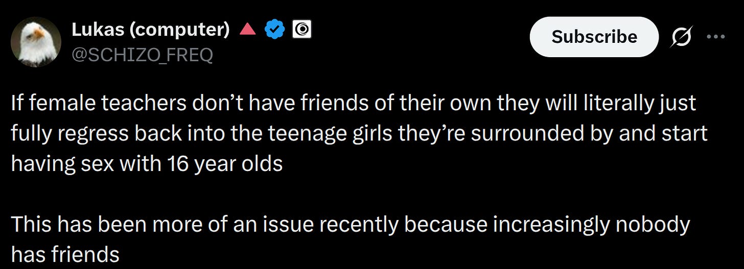 There is no one reason why somebody decides to try to have sex with a teenager, though one thing unites all cases: they chose a teenager over an adult, or loneliness. I think a lot of the reasons people espouse out: a lack of morality or desire for power, are framed incorrectly or too reductive. They’re making choices under uncertainty and incentives.