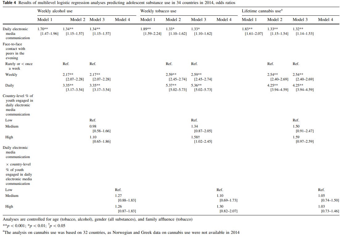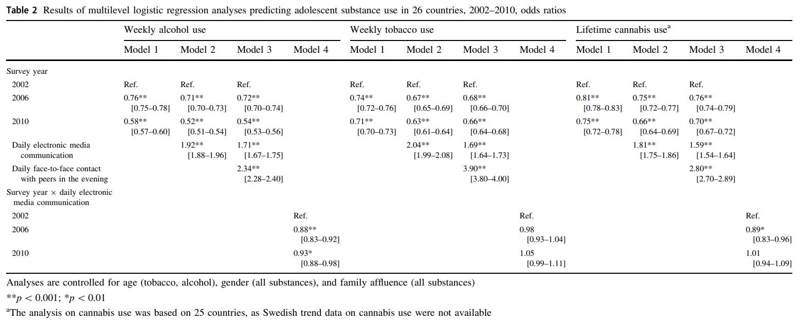 Let me look at the main source that suggests the decline is due to face to face socialising. Their regression table is pretty unambigious, extremely low p-value: