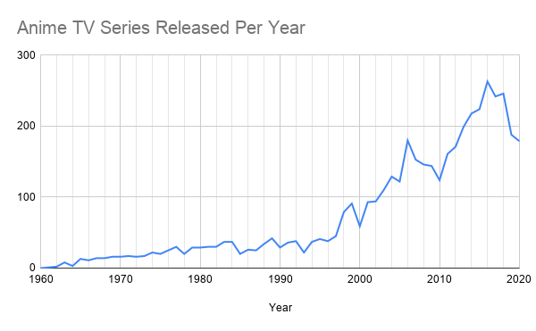 The raw quantity of film and anime has increased by an order of magnitude in the last 20 years, but 17500 films have been released in 2020 and 300 anime were shipped out (not aired) that year. Those numbers also differ greatly, but I feel like the “rise to the top” effect is pretty similar in both mediums and isn’t affected that much by the raw amount of content. More coal doesn’t hide the gems if they are shiny enough.